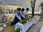 今年度は学友会長の廣田さん、副会長の小山さん、総務委員長の武部さんの3名が参列しました。8時の開式後、学友会長による追悼のことばが読み上げられ、全校生徒と教職員で折った千羽鶴が学友会副会長によって捧げられました。その後、参列者による献花が行われ、8時15分から参列者全員で1分間の黙祷を捧げました。