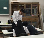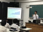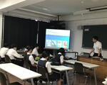 自己充填コンクリートや3Dプリント技術の紹介では、校長先生と企業との共同研究が報道された映像を見て、「コンクリート(=校長先生)ってすごい!」と目を輝かせる生徒たち。