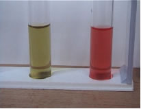 雨水を入れた1本の試験管に,"酸性雨測定用試薬"を目薬をさすときの要領で3滴たらして,軽く振って色が均一になるように混ぜます。試薬の色がどのような色に変化したか,簡易酸性雨測定セットの中の比色紙の酸性雨比色表とくらべて,一番近い色のpHの値を読みます。