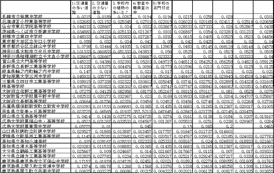 測定が実施された学校の測定値の平均値が、調査場所毎に表 0-2に示されている。