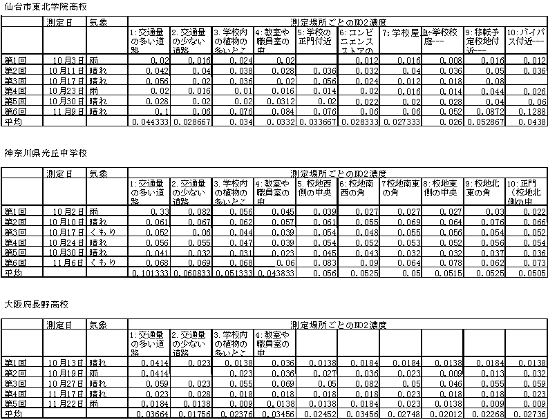 表 -3 各校の測定場所毎のNO2濃度一覧(1/3)